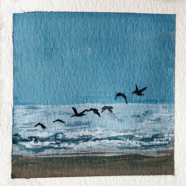 The sky is an endless expanse of cloudless blue. Gentle waves roll towards the shore as a flock of pelicans flies in formation to the water.