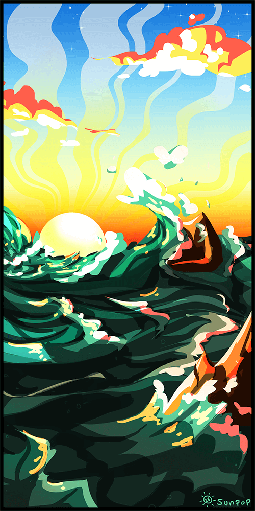 lineless digital art depicting the ocean at sunset. rough turquose waves splash against brown rocks. the sun sits on the horizon, emitting wavy rays. the sky is gradiented, starting orange at the horizon and fading to blue at the top of the image, dotted with stars. fluffy clouds pass overhead.