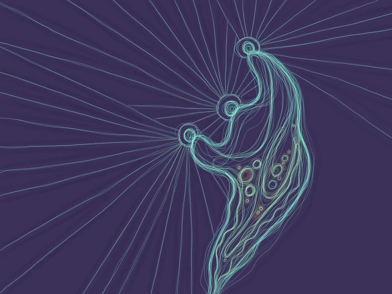 a loose, abstract line drawing of a collotheca rotifer with oral cilia fanned out, drawn in bright blue-green on a dark canvas. inspired by the soft glowing edges of organisms under dark-field microscopic photography.