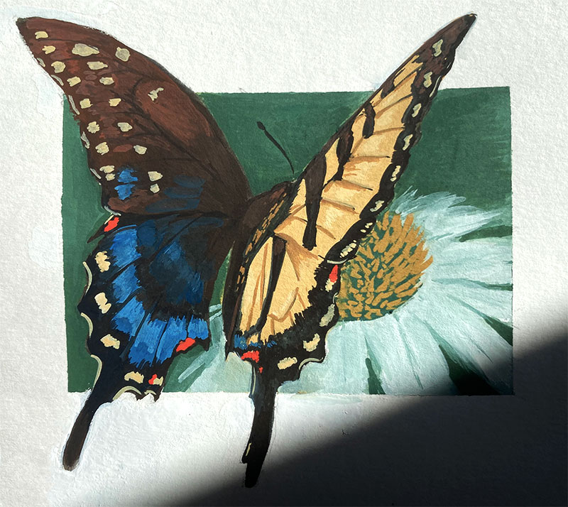 The painting was done using four paints: Prussian blue, cadmium red, yellow ochre, and white. A glitter gel pen was used to add iridescent glitter to the blue spots on the butterfly's hindwings. The photo of the painting was taken in a sunbeam.