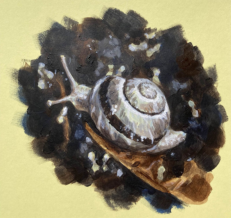 An acrylic painting of a silvery taupe snail crawling through the forest floor. The ground is covered in leaf litter with seedlings poking out from the earth. The snail is rendered in detail, while the background has been painted in an impressionistic style with a larger brush and a visible rough texture around the edges. The colors are muted and earthy.