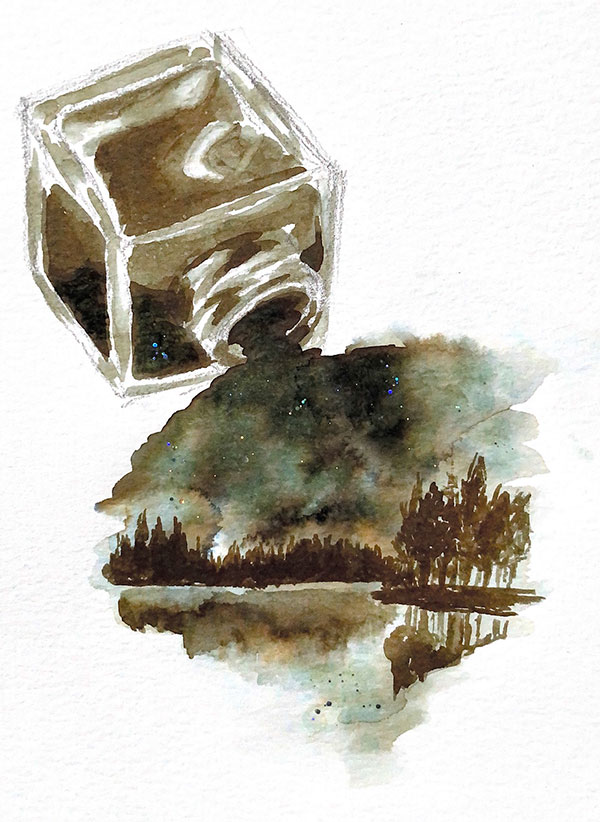 An ink painting of a spilled ink bottle. (The bottle in the painting holds the ink that was used to paint it.) The spilled ink transitions into a painting of a starry night sky looming over a forest of deciduous trees. The trees and stars are reflected in a lake. The sky was created by dropping ink in water, resulting in abstract blooms that resemble clouds. Glitter varnish was brushed over the sky to create the stars.