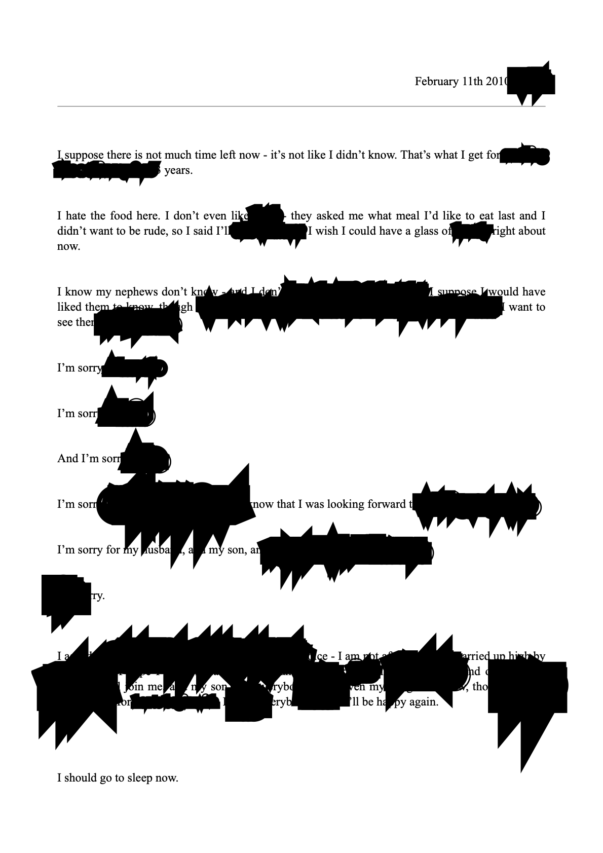 a text dated February 11th 2010, seemingly detailing someone's last diary entry before dying. the words become more and more illegible, covered by something akin to digital ink smudges. the last sentence is completely legible: "I should go to sleep now.".